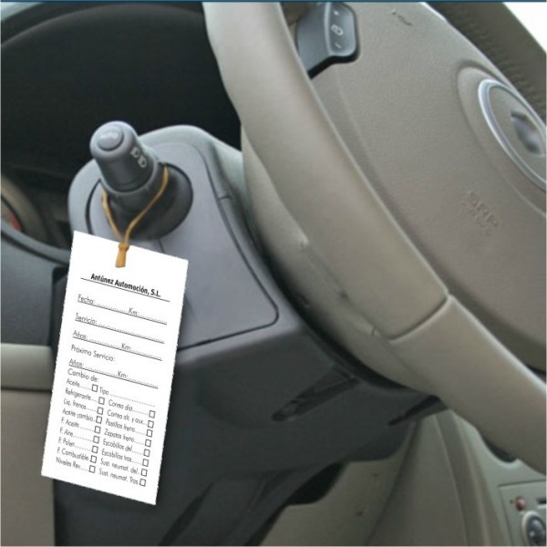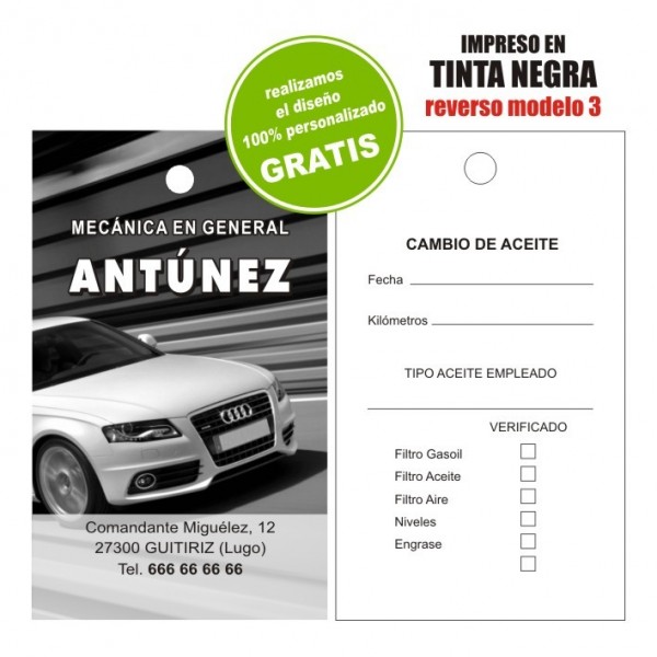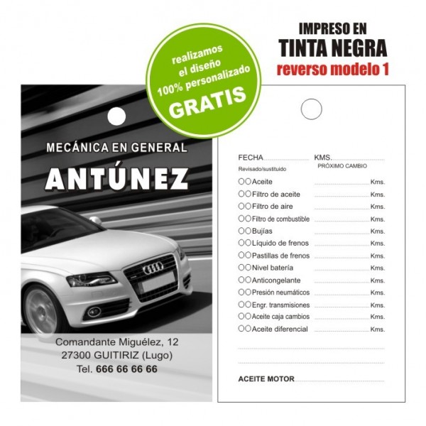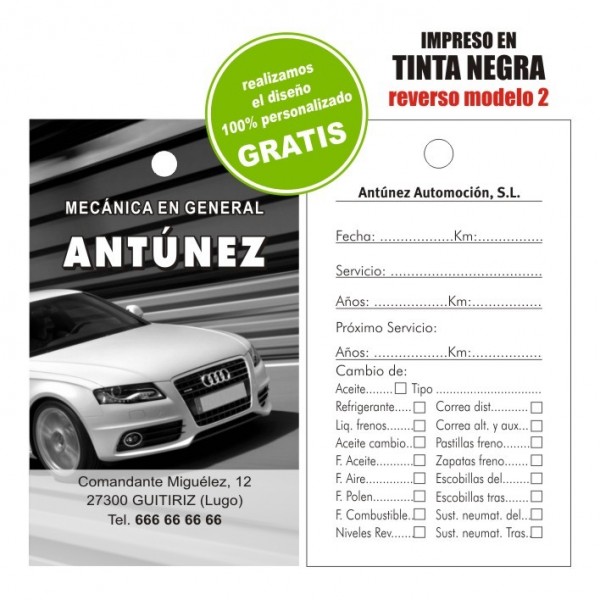 • las etiquetas de mantenimiento están compuestas por una cartulina impresa por la 2 caras. Por el anverso lleva los datos del taller, logotipo, fotos,... y por el reverso los campos necesarios para el control del mantenimiento del vehículo, se puede elegir entre los modelos de reversos adjuntos o personalizamos los campos según sus necesidades